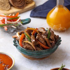7oz of Grass-Fed & 28 days Dry-Aged Beef Fillet Strips Marinated & Sauteed Tradional way with Ethiopian Spices, Organic Red Onion, Tomato & Jalapeno slices, served on a traditional Hand-made…